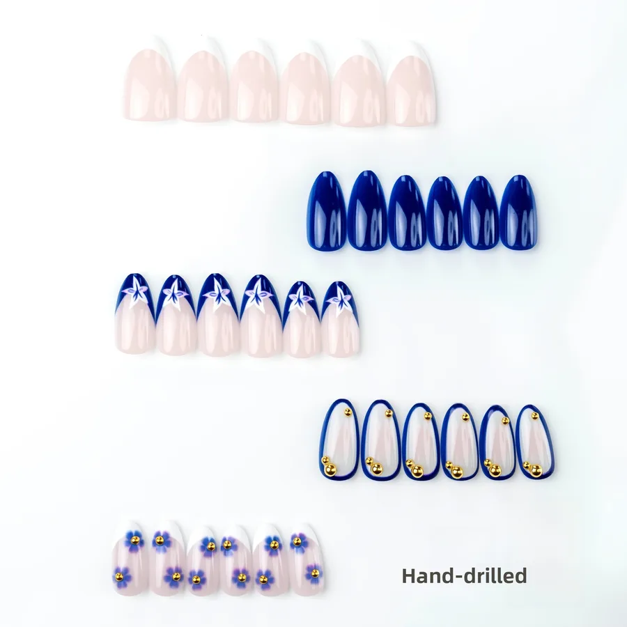 Artificial Blue Flower Short Almond Shape Fake Nails Diamond Patch Beautiful Nail Art Wearable Plastic Nail Tips for Valentine’s Day