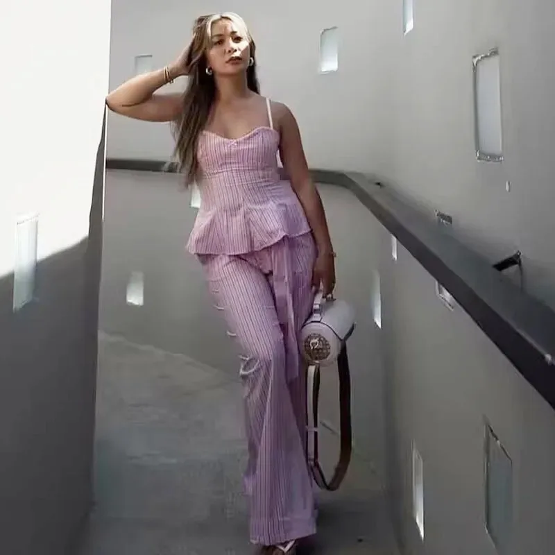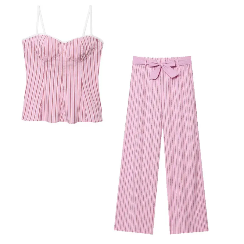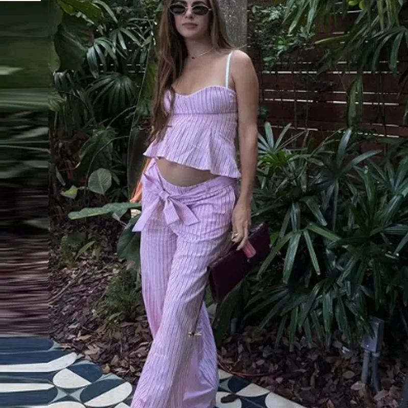 Casual Stripe Pant Co-ord Set in Polyester with Sleeveless Top, Full Length Pants, 2 Pieces Set
