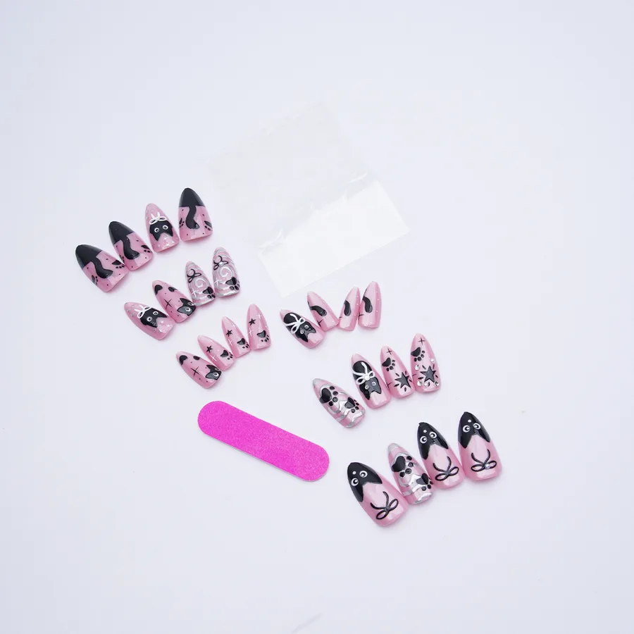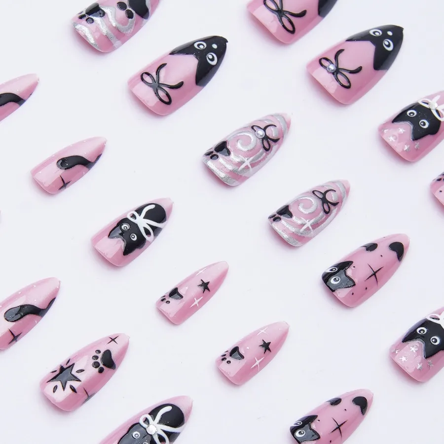 Cat Eye Wearable Nail Art Almond Shape Cat Print Bowknot Glitter Diamond Detachable Nail Tips French Style