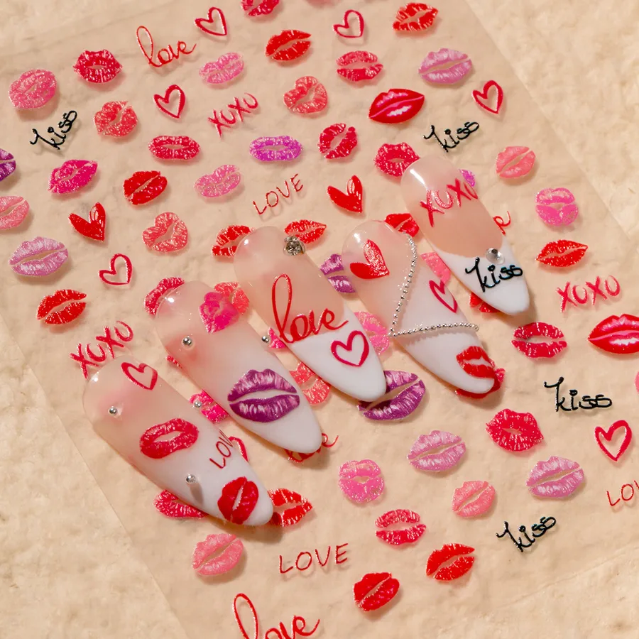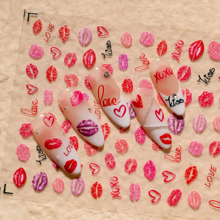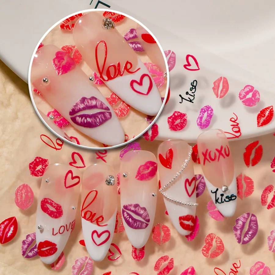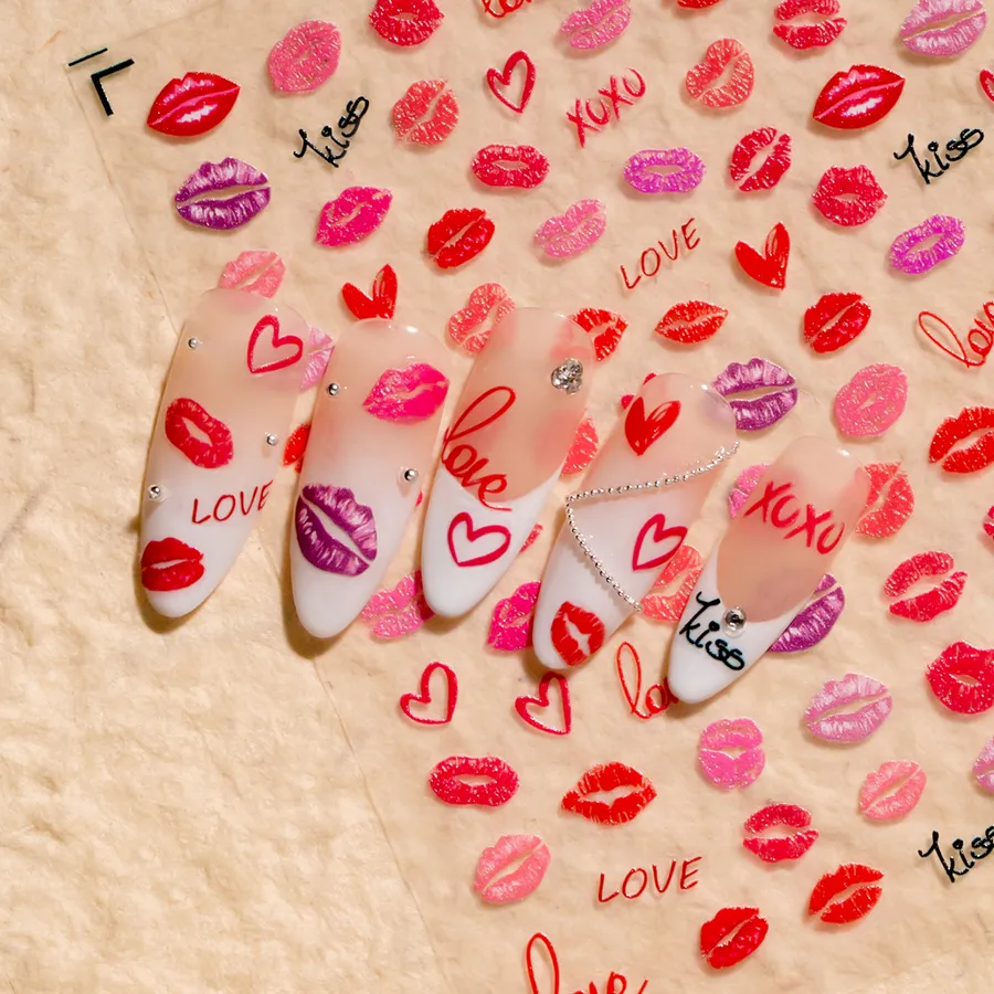 Valentine’s Day Nail Stickers with Lips, Hearts, Letters/Sweet Resin Material Suitable for Valentine’s Day Themed Nail Art