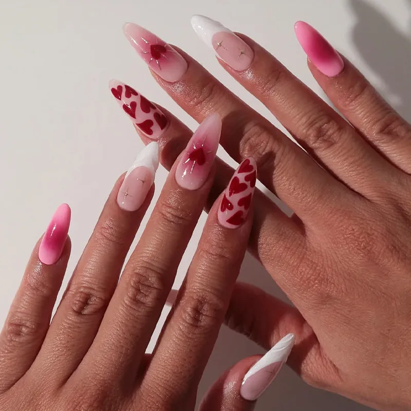 Valentine’s Day Wearable French Red Almond False Nails Gradient Smoky Manicure Simple Metal Material Geometry